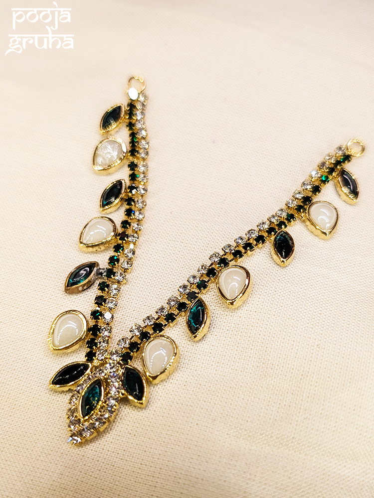 Elegant kundan necklace designed with black and white leaf-shaped stones. This classic V-shape pattern makes it a graceful choice for Mata Rani, Radha Krishna, or any festive deity shringar.