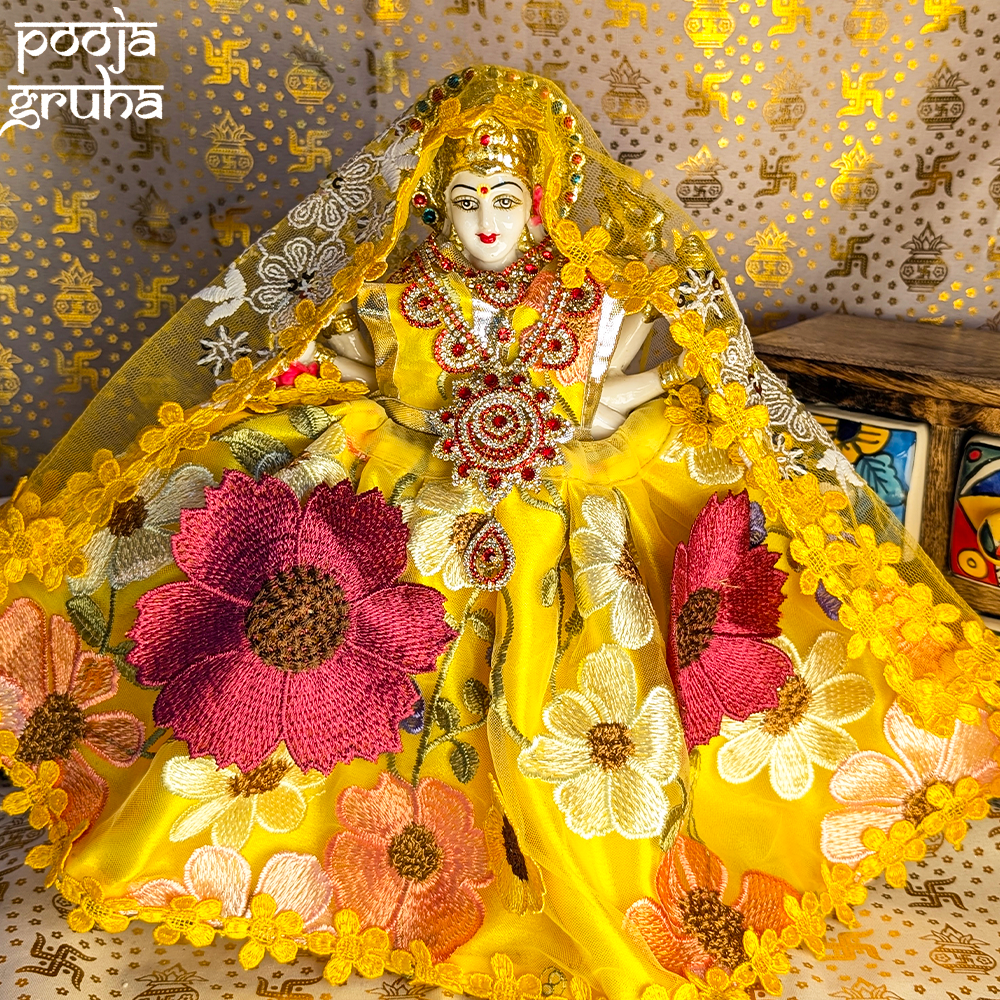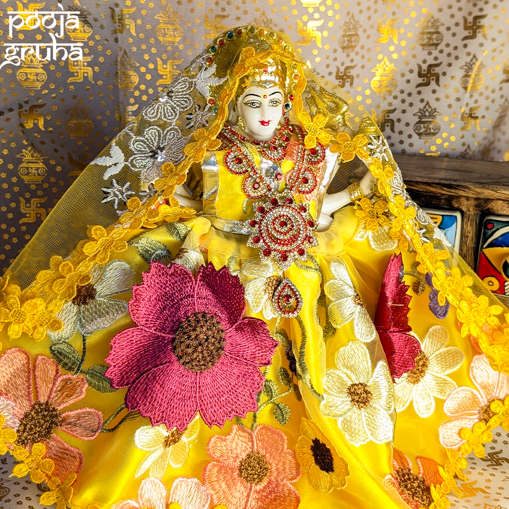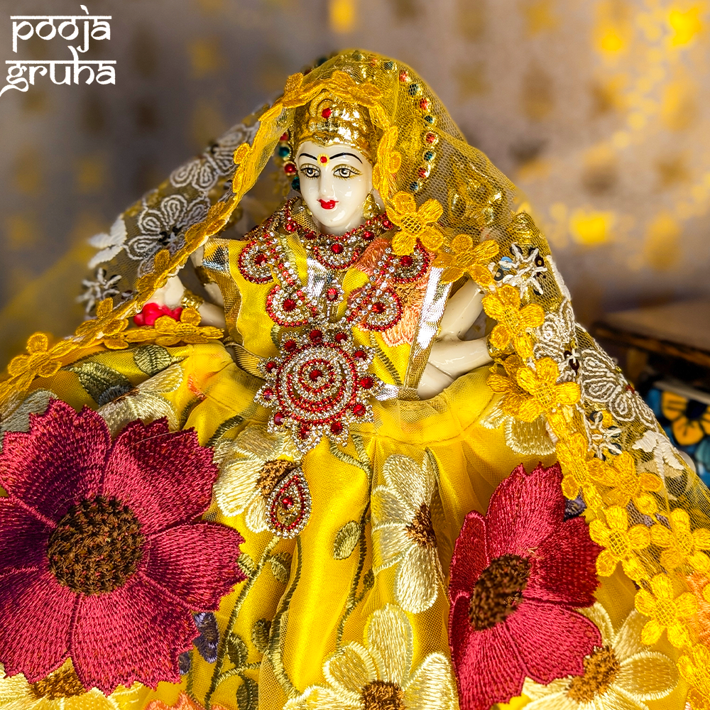 A respectful floral ensemble honoring Mata Rani with serene temple elegance. Created for Basant Panchami, Navratri and daily Darshan, Pushpa Vastra reflects purity and the divine warmth of blessings entering the home.