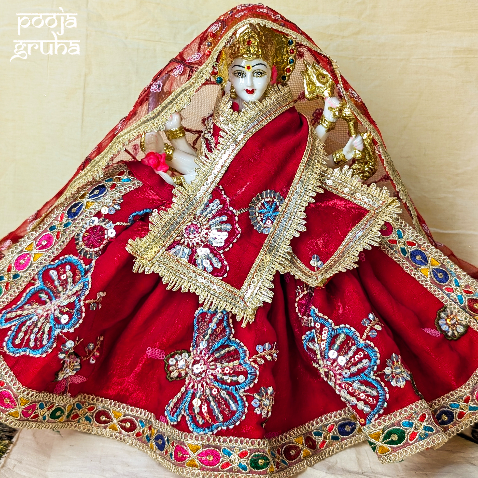 Vibrant and divine, Shringarini captures the essence of festive adornment for Mata Rani. The glowing red base, mirror detailing, and intricate embroidery mirror the sacred radiance of the Goddess herself. Perfect for Navratri, Diwali, or any grand temple celebration.