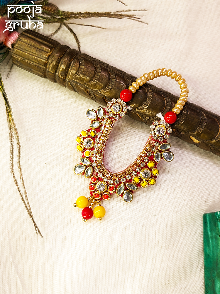 A bright and festive necklace filled with kundan and colored stone detailing. Its round frame and colorful floral accents make it ideal for Devi shringar or festive pooja rituals.